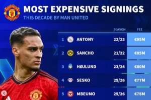 体育资讯4月19日讯 《转会市场》统计了曼联自2020年以来的最贵引援情况,B费仅位列第9位。